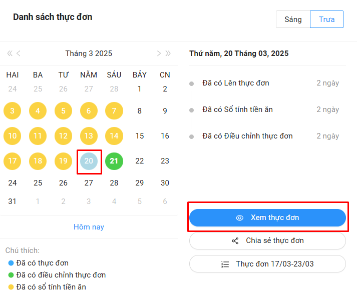 Bước 1: Tại Danh sách thực đơn chọn vào ngày muốn xem -> bấm vào Xem thực đơn