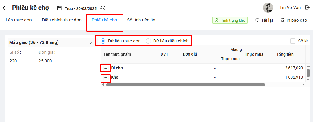Lưu ý: Phiếu kê chợ có thể chọn lấy dữ liệu từ lên thực đơn hoặc từ dữ liệu điều chỉnh thực đơn