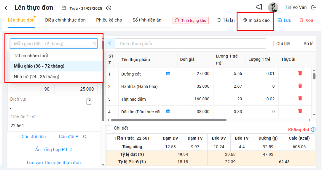 Bước 1: Vào lên thực đơn -> chọn nhóm tuổi và bấm In báo cáo