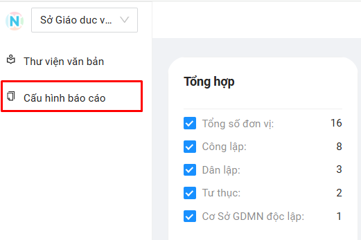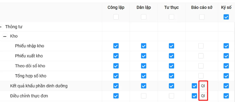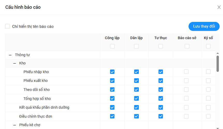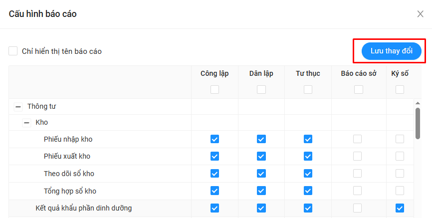 - 3 cột đầu tiên (Công lập, Dân lập, Tư thục): check hoặc bỏ check tương ứng với hiện/không hiện báo cáo theo loại hình trường