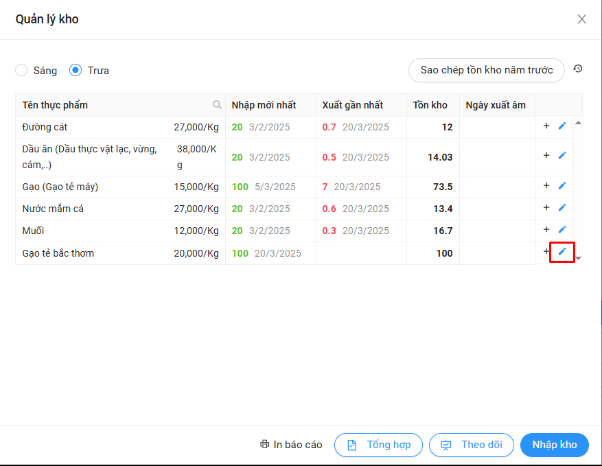 Chỉnh sửa lại lượng thực phẩm đã nhập kho