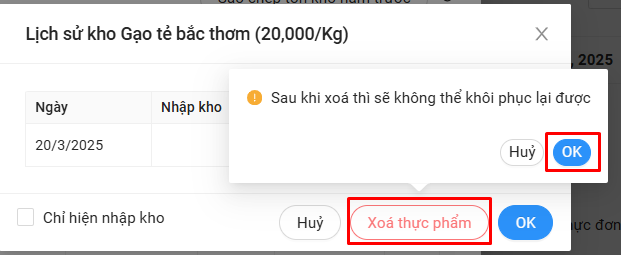 Bước 3: Xác nhận OK để xóa thực phẩm kho