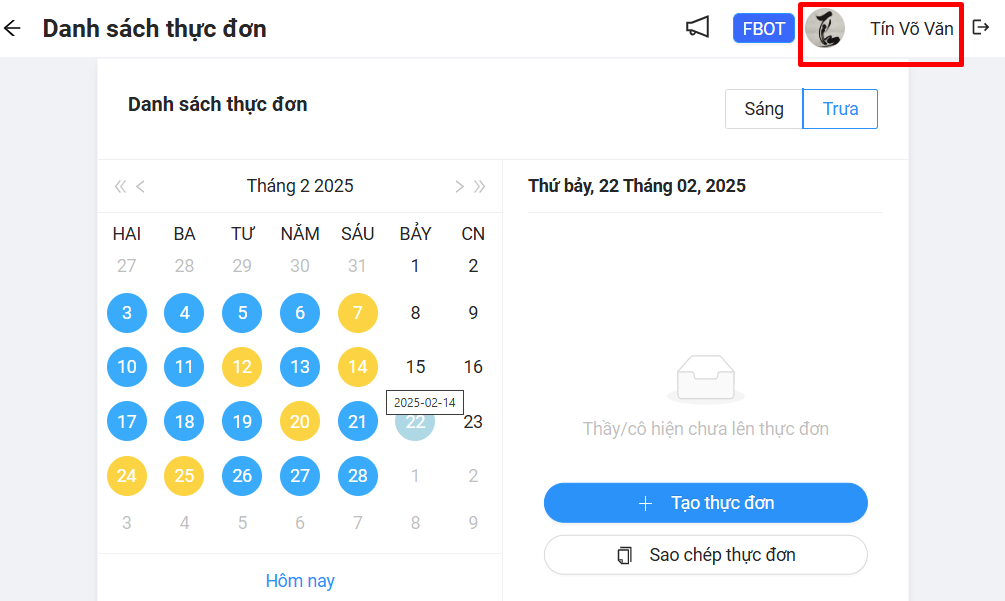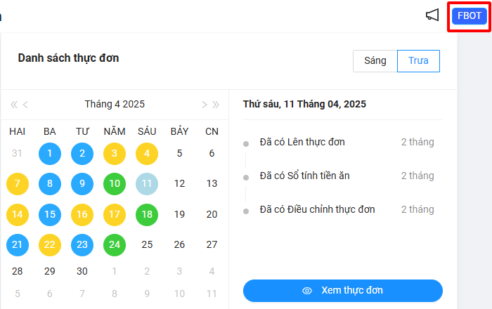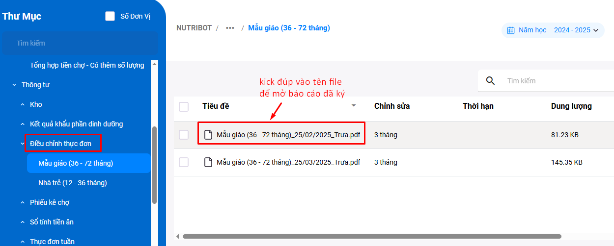 Sau khi đăng nhập thành công vào FBOT bên trái phần mềm sẽ có thư mục tên NUTRIBOT, trong thư mục này sẽ có các thư mục con là: Khác (tổng hợp tiền chợ, tổng hợp sổ tính tiền ăn) và Thông tư (kho, kết quả khẩu phần dinh dưỡng, điều chỉnh thực đơn, phiếu kê chợ, sổ tính tiền ăn, thực đơn tuần), các báo cáo thầy/cô đã ký sẽ lưu trữ vào những thư mục này.