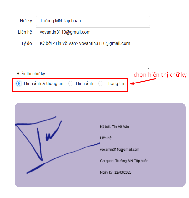 - Hình ảnh & thông tin: hiển thị chữ ký và bên cạnh có thông tin của người ký như: email, đơn vị, ngày ký,…