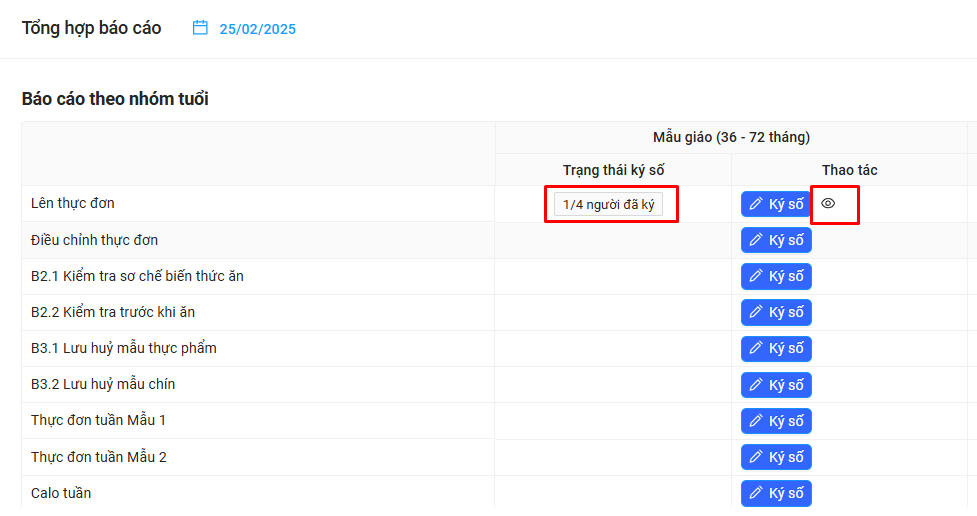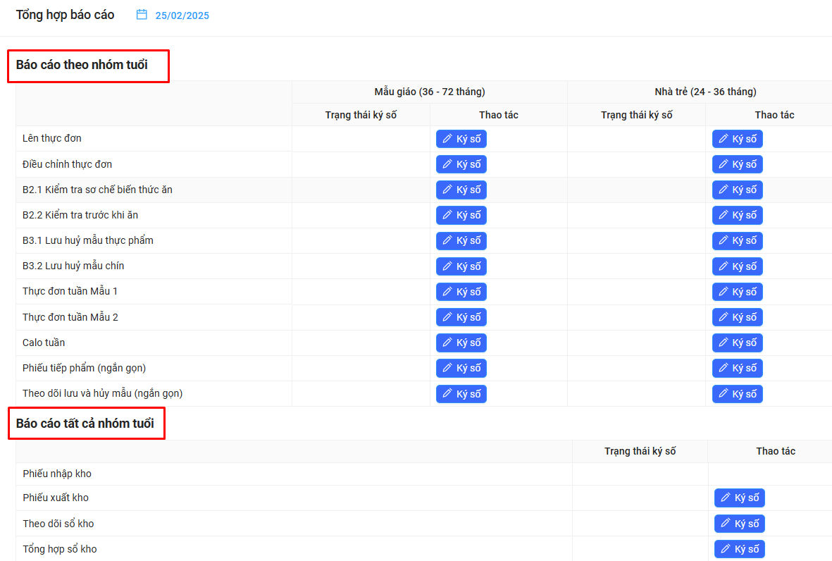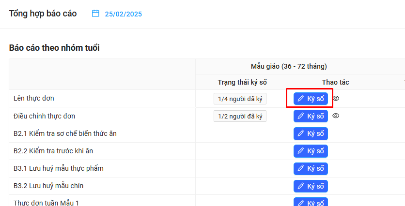 Bước 2: Cô muốn ký vào báo cáo nào, của nhóm tuổi nào thì bấm vào nút Ký số của báo cáo đó