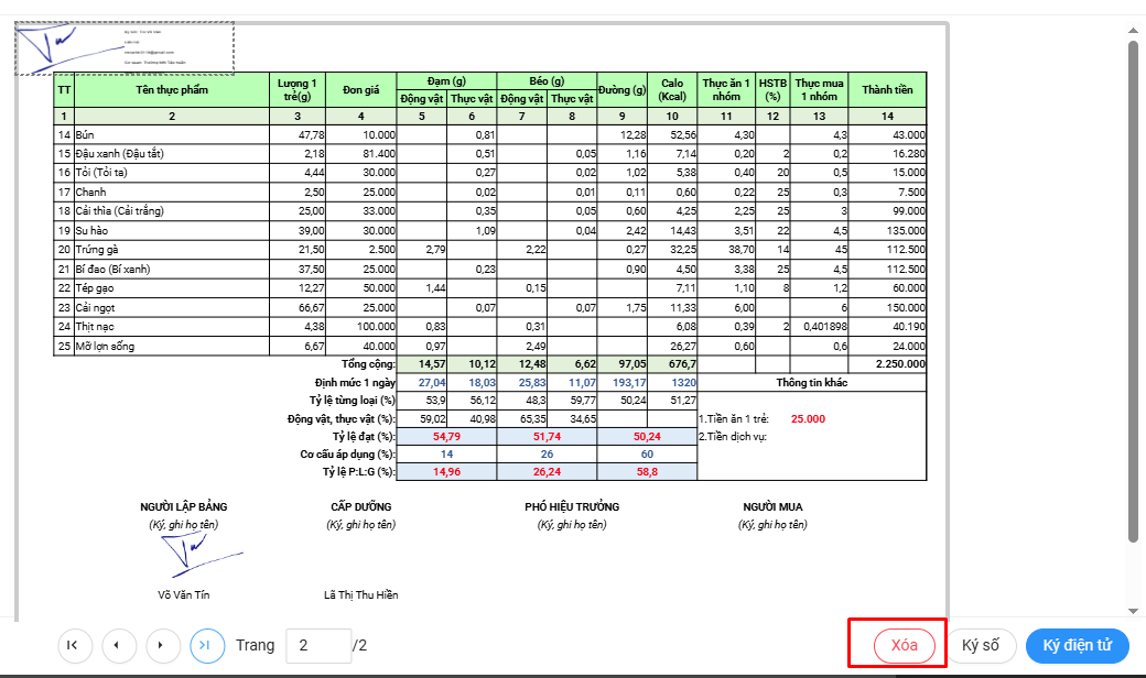 Lưu ý: trường hợp báo cáo đã có nhiều bên ký, thì khi Cô bấm xoá sẽ xoá tất cả chữ ký của các bên. Sau khi Cô ký xong thì các bên khác sẽ ký lại báo cáo này