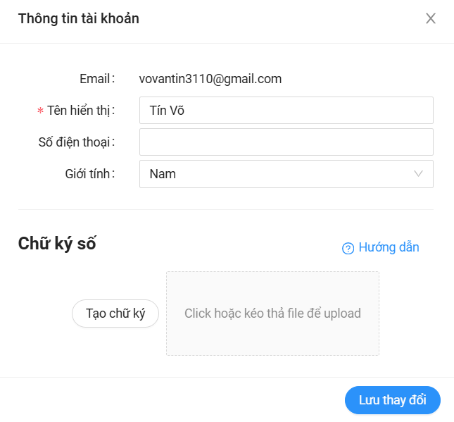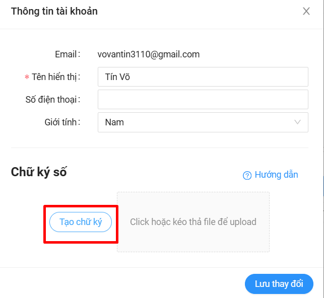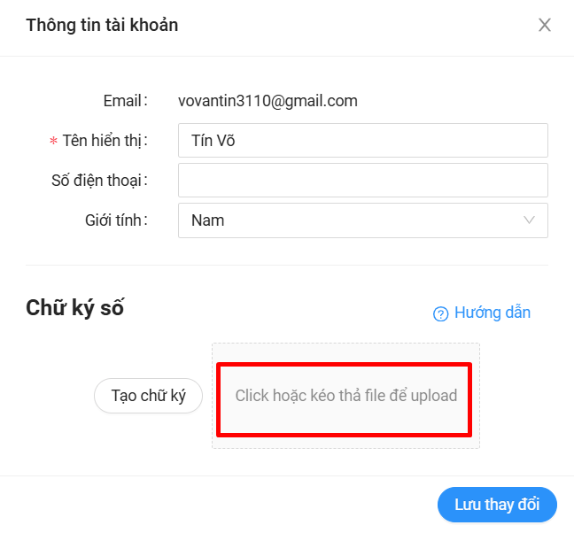 - Ở bảng Thông tin tài khoản, bấm vào dòng Click hoặc kéo thả file để upload sau đó chọn hình chữ ký để đưa vào phần mềm và Lưu thay đổi