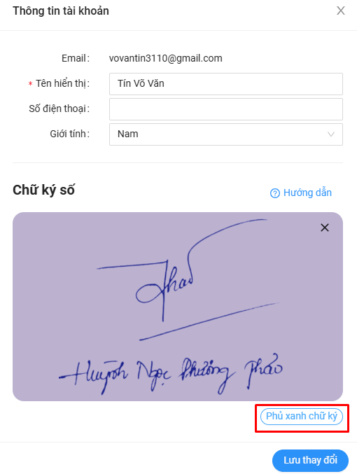 - Trường hợp nét chữ ký bị mờ thì Cô bấm vào nút Phủ xanh chữ ký để tăng độ đậm cho nét chữ ký