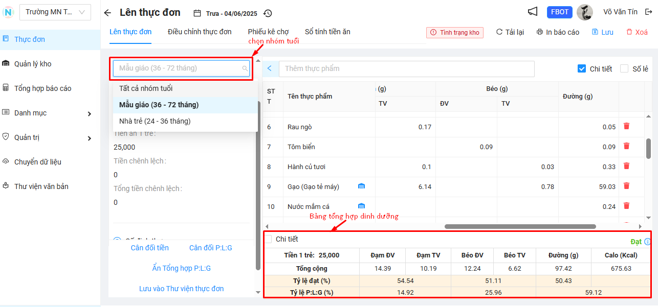 Sau khi thầy/cô nhập xong thông tin vào thực đơn, dựa theo sỉ số và danh sách thực phẩm sử dụng, phần mềm sẽ tự động tính ra tỷ lệ các chất đạm - béo - đường và lượng calo theo từng độ tuổi. Bảng tổng hợp dinh dưỡng sẽ thể hiện các thông số về dinh dưỡng theo cơ sở khoa học và hướng dẫn từ viện dinh dưỡng, giúp thầy/cô dễ dàng nhận thấy dưỡng chất còn thiếu hoặc chưa cân bằng để điều chỉnh.