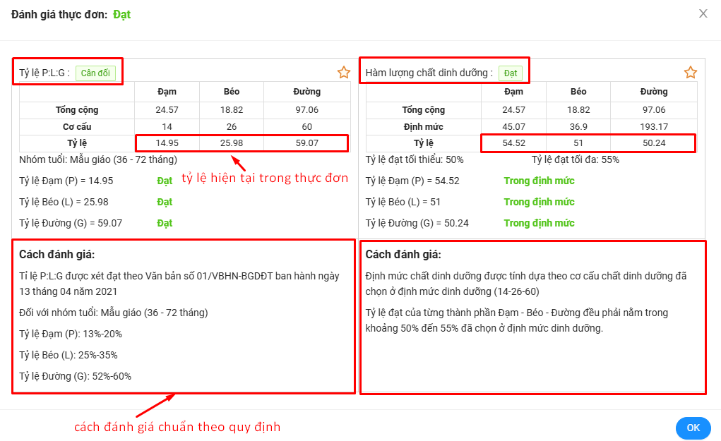 Một thực đơn đạt dinh dưỡng cần đảm bảo Tỷ lệ đạt và Tỷ lệ P:L:G nằm trong mức quy định. Thầy/cô chỉ cần xem bảng tổng hợp dinh dưỡng và so sánh giữa dòng Tỷ lệ P:L:G với Cơ cấu quy định(%), Tỷ lệ đạt(%) với hàm lượng dinh dưỡng quy định của độ tuổi để biết tỷ lệ chất nào đang cao hay thấp và cân đối cho các chất đạt theo quy định.