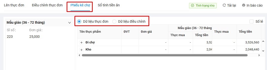 - Đối với trường có sử dụng tính năng Điều chỉnh thực đơn, nếu trong một ngày Sổ tính tiền ăn không hiển thị số liệu, thầy/cô cần kiểm tra lại bên Điều chỉnh thực đơn đã có thông tin chưa