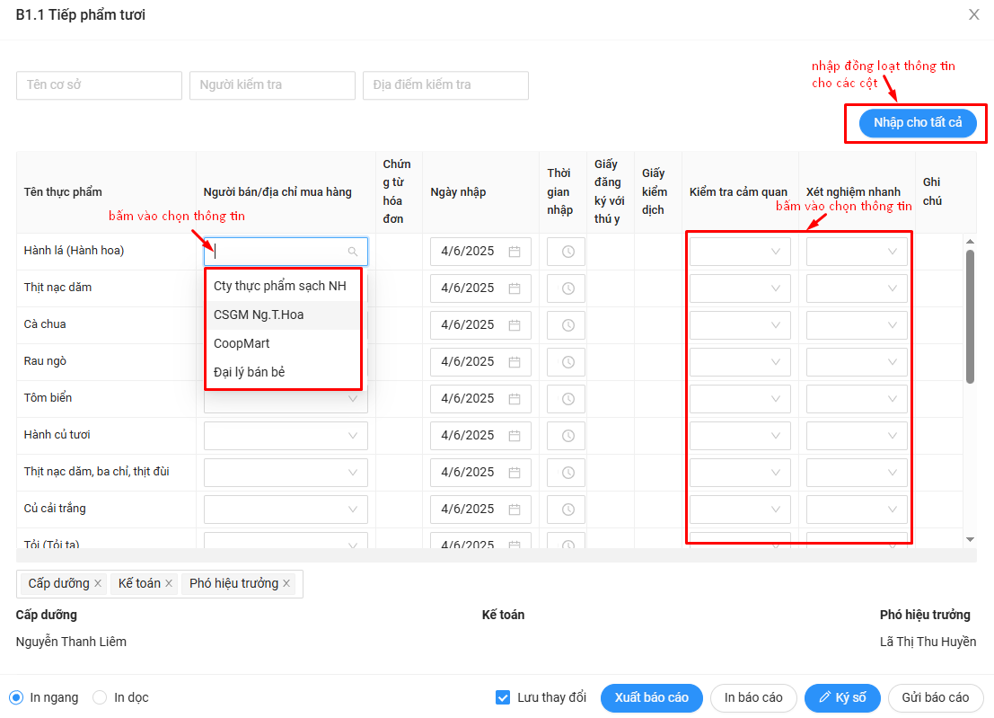 💡Với những cột có thông tin giống nhau, thay vì phải nhập cho từng ô, thầy/cô có thể nhập đồng loạt bằng cách nhấn nút Nhập cho tất cả và điền thông tin chung cho cột đó. Ví dụ: trong ngày tất cả thực phẩm đều mua ở CoopMart, thầy/cô chỉ cần bấm nút Nhập cho tất cả, sau đó chọn thông tin người bán/địa chỉ là “CoopMart”. Hệ thống sẽ tự động điền thông tin này cho toàn bộ các dòng