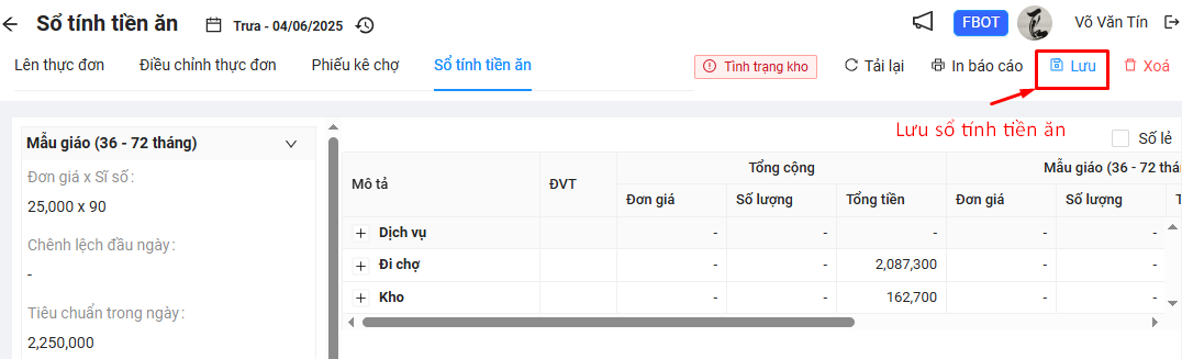 - Trong sổ tính tiền ăn phần mềm có hiển thị phần lũy kế từ đầu tháng đến ngày hiện tại. Để lũy kế đúng thông tin tiền chi kho, chi chợ, tổng số suất ăn,.. đến ngày hiện tại, thầy/cô cần đảm bảo sổ tính tiền ăn của những ngày trước đều đã được lưu.
