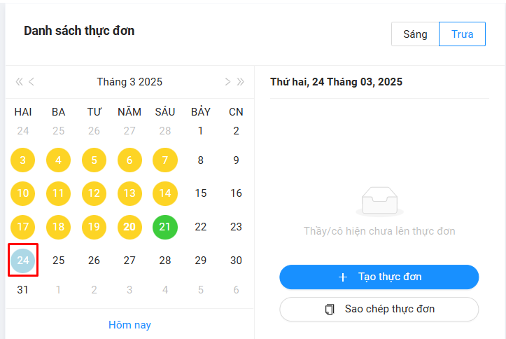 - Từ ngày đã có thực đơn: thầy/cô bấm vào chọn ngày để chọn ngày đã có thực đơn