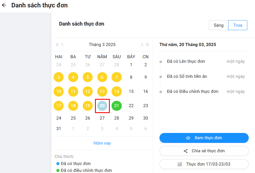 Bước 1: Tại Danh sách thực đơn chọn ngày cần xóa thực đơn