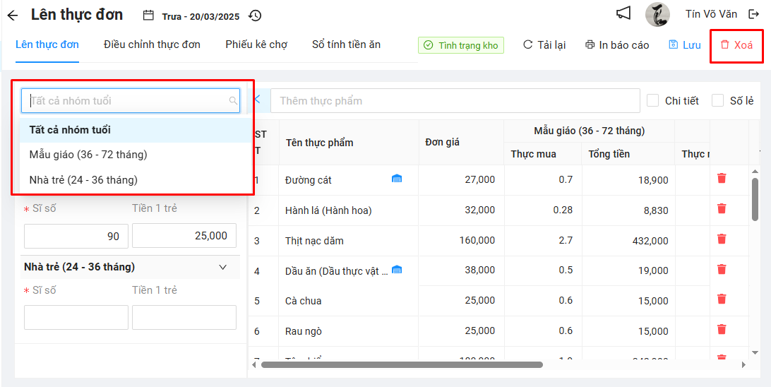 - Trường hợp không thấy nút Xóa là do thầy/cô đã lưu STTA trong ngày. Muốn xóa thực đơn thầy/cô xóa STTA trước.
