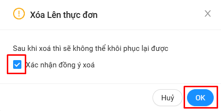 - Sau khi xác nhận xóa thực đơn sẽ không khôi phục lại được