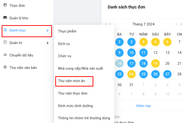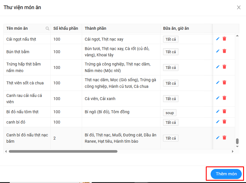 • Khi lên thực đơn thầy/cô có thể chọn món ăn đã lưu trong Thư viện món ăn