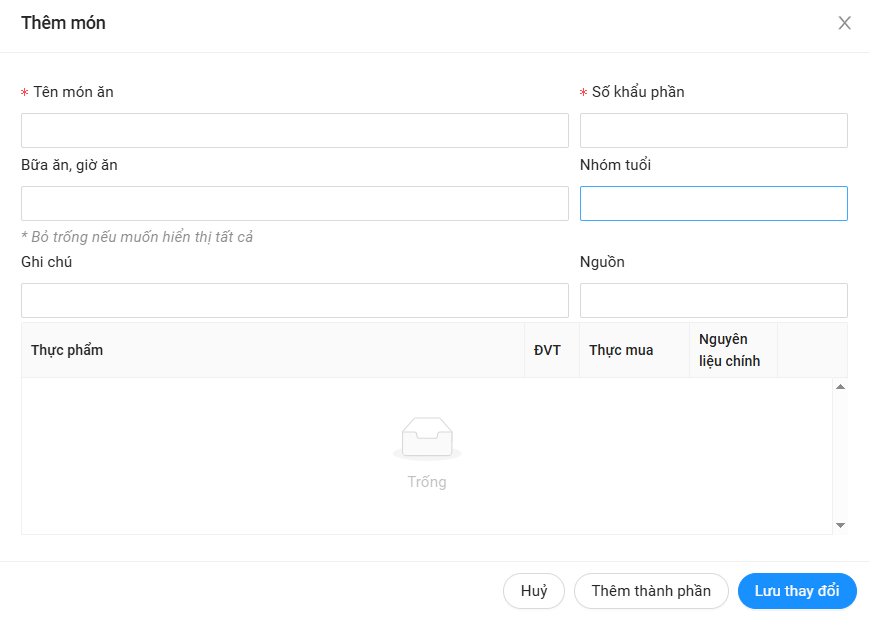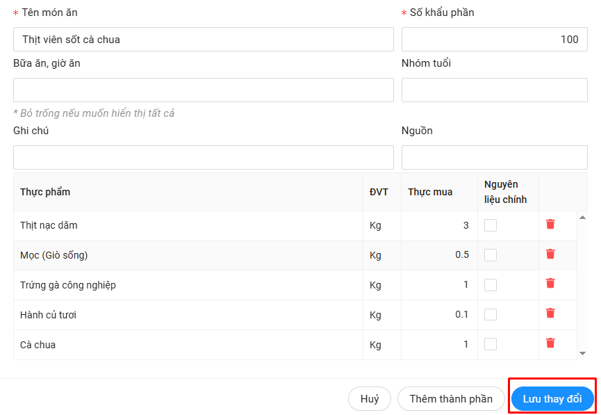 - Nút Thêm thành phần: chọn tên thực phẩm cần sử dụng, số lượng theo khẩu phần ăn
