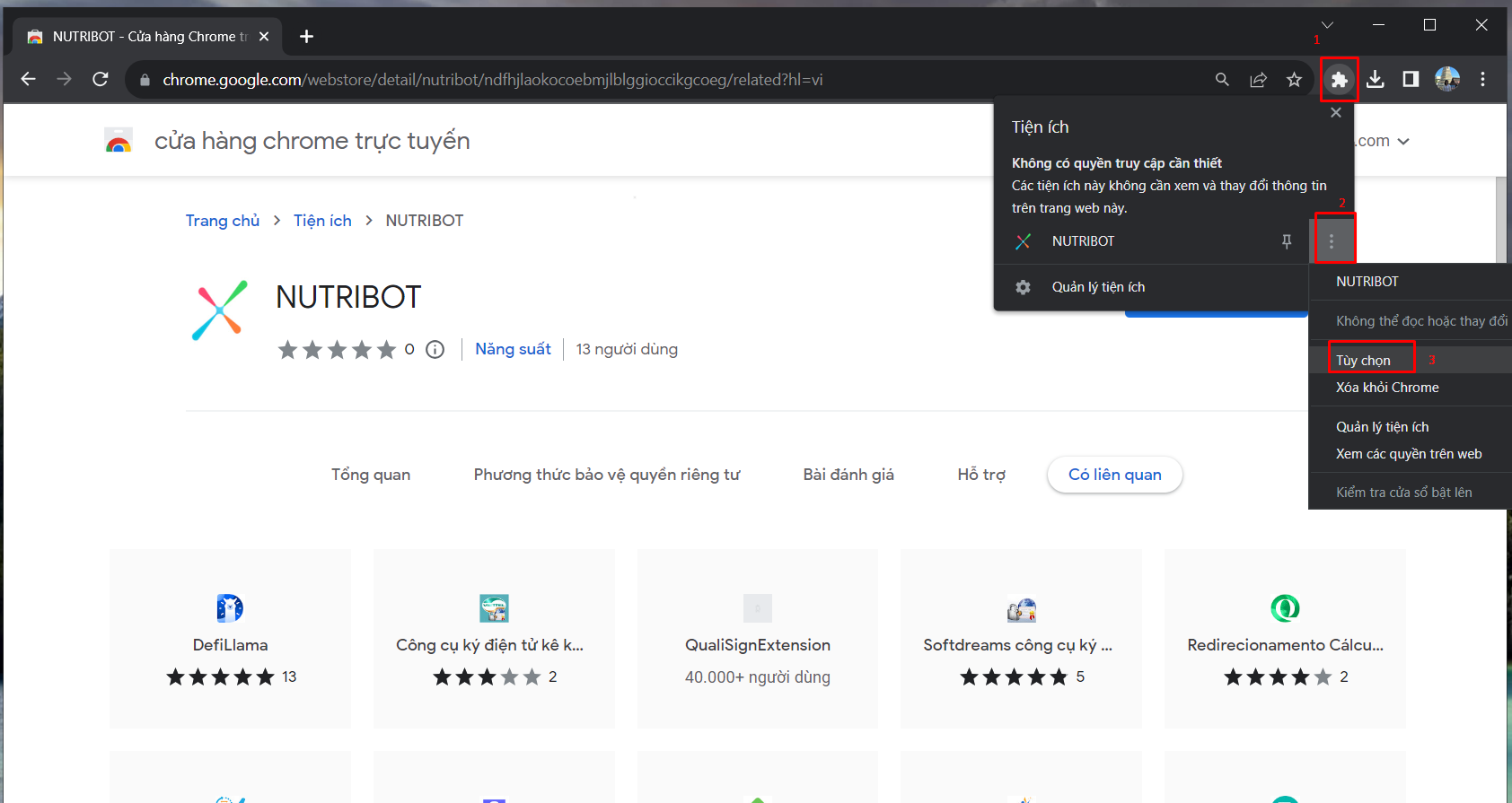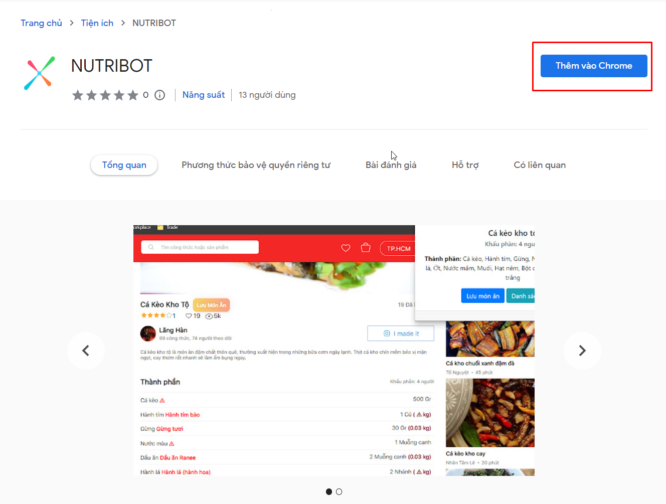 - Truy cập link: https://chrome.google.com/webstore/detail/nutribot/ndfhjlaokocoebmjlblggioccikgcoeg?hl=vi