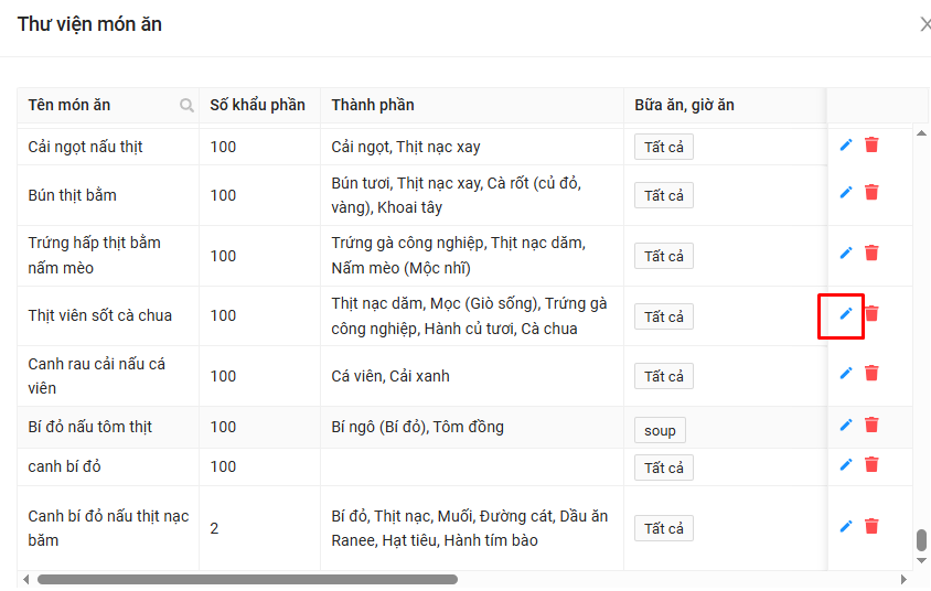 Bước 1: Bấm vào biểu tượng cây bút tại món ăn muốn sửa thông tin
