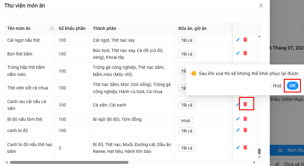 Bước 2: Bấm OK để xác nhận xóa món ăn